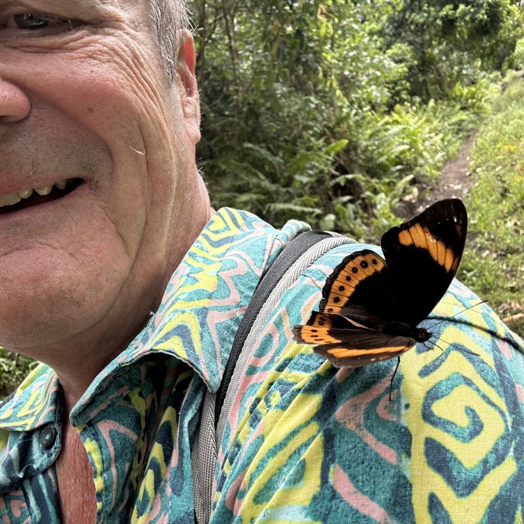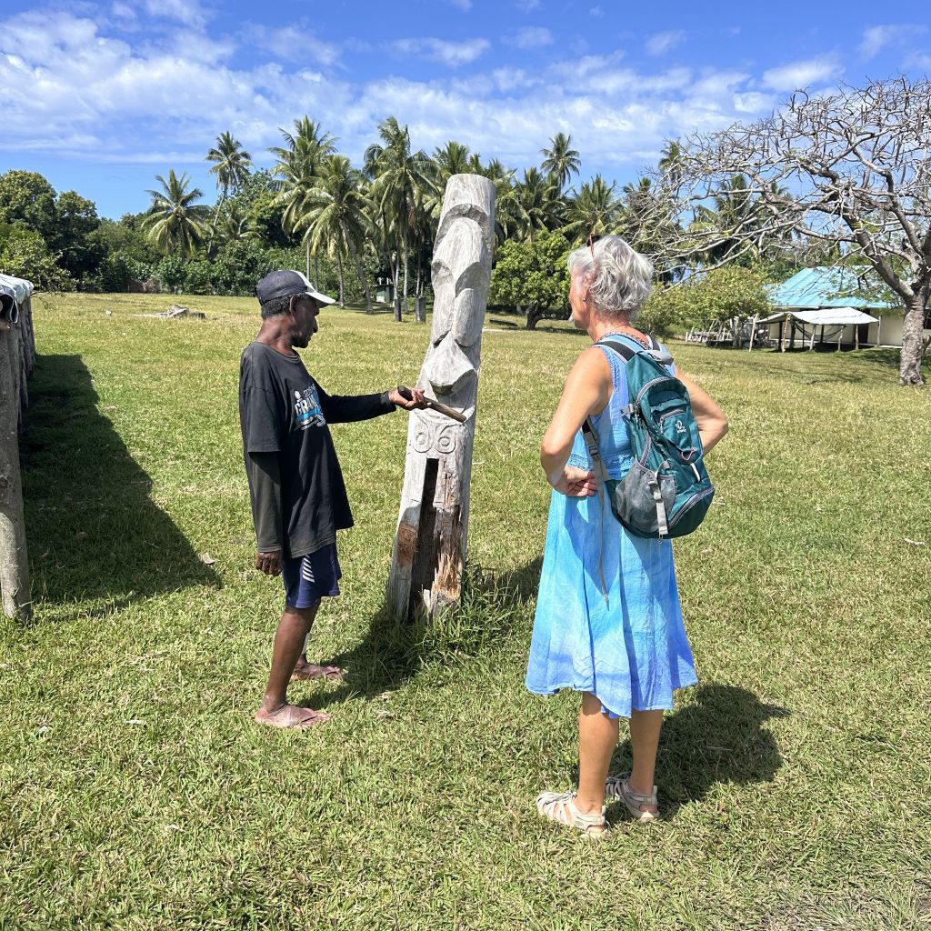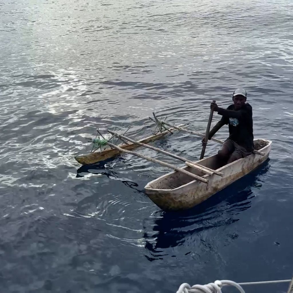Wir nehmen Francis‘ Angebot an, am nächsten Morgen mit ihm einen Hügel zu besteigen, auf dem einer von drei Sendemasten steht, die die Insel mit Kommunikationsdiensten versorgen. Im Zeitalter von Starlink ist es ein veraltetes Modell, aber derzeit noch in Betrieb. Francis versorgt uns unterwegs mit Obst und öffnet eine Kokosnuss. Francis hat seine Machete dabei und schafft auf dem Gipfel einen freien Blick auf das Meer und die beiden Vulkane der Insel. Francis nimmt auch eine Rolle Draht mit, die eindeutig den Betreibern des Sendemasts gehört. Auf dem Rückweg lässt sich vertrauensvoll ein Schmetterling auf meiner Schulter nieder.