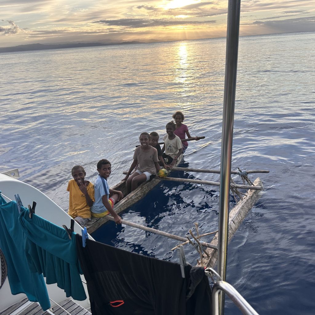 We move to Craig Cove on Ambrym. Craig Cove is located opposite the fjord of Port Sandwich. Here we meet Francis, who offers his services as a guide. Immediately after Francis, seven children between the ages of 12 and 13 board our catamaran with their dugout canoe. The children are extremely well-behaved and enjoy a glass of cola.