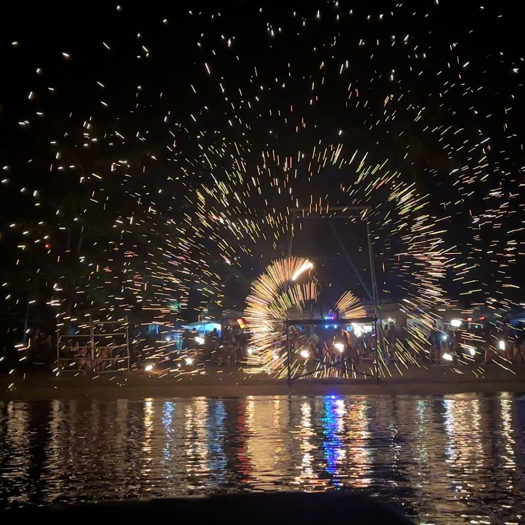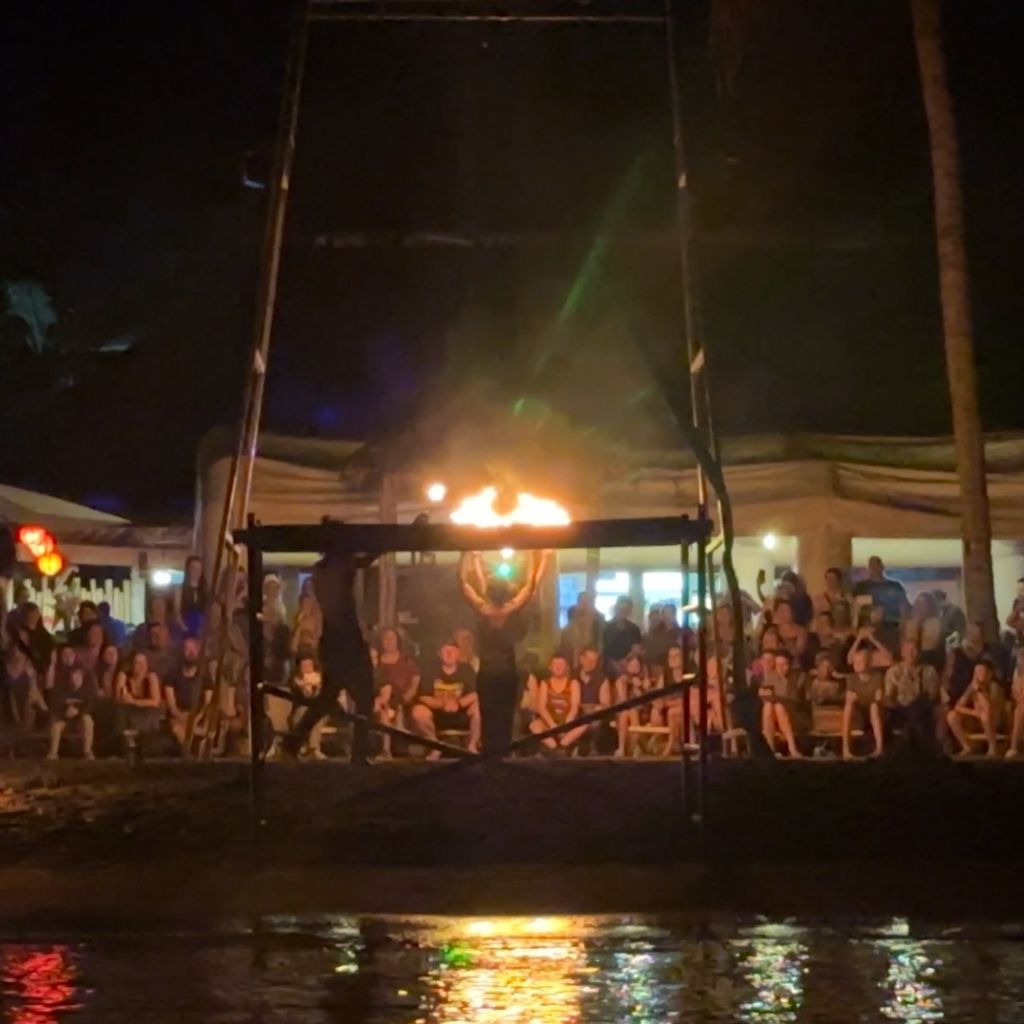 A few weeks ago, we visited Mele Beach Club to admire the circus show. We traveled there by bus along a road riddled with potholes. Today, we are anchored here. The fire show is really famous. It takes place on Friday and Saturday, as the restaurant would be bursting at the seams if it were held on just one day. On the first evening, we meet in the restaurant with a view of the sea and MariaNoa. On the second evening, we take part in a floating dinghy party with a view of the fire show from the water.