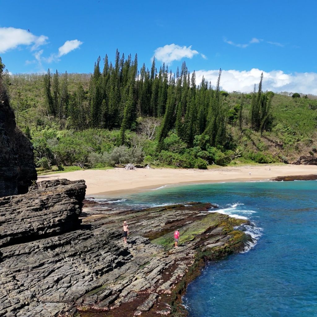 In the capital city of Nouméa, we rent a car to explore at least the southwestern part of Grand Terre. We visit Baie de Gouero, a particularly scenic bay where swimming is prohibited for safety reasons. However, this prohibition does not seem to apply to surfers. Young locals come through a natural tunnel with their boards to swim out to the waves.