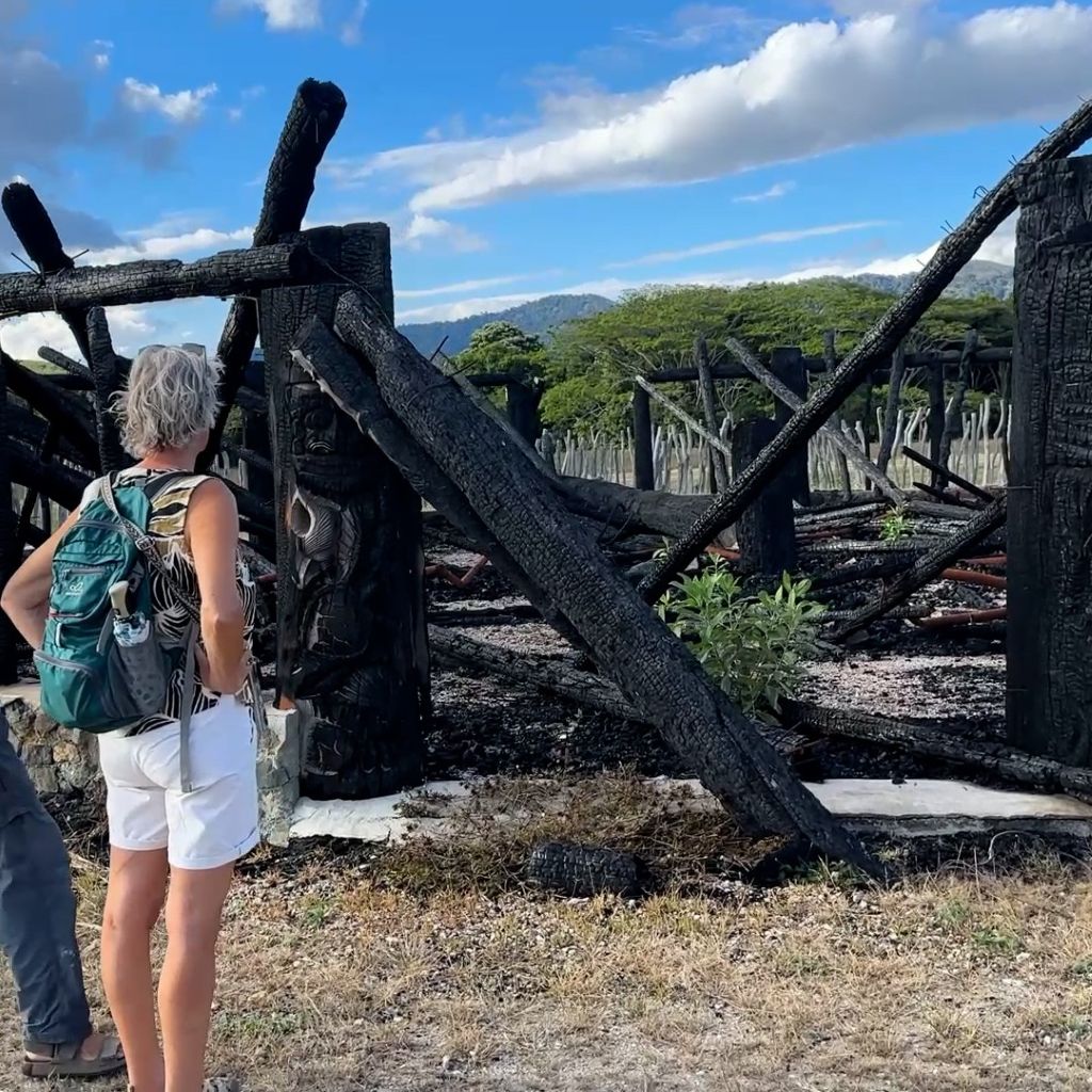 Während in Vanuatu die Dorfbewohner in ihren traditionellen Häusern wie vor tausend Jahren leben, gibt es diese Architektur in Neukaledonien nur noch in Ausstellungen und in Freilichtmuseen. Wir kommen an den Ruinen des niedergebrannten Case du domaine de Deva vorbei. Vor einigen Monaten gab es in Neukaledonien Ausschreitungen zwischen den Einheimischen und der französischstämmigen Bevölkerung. Ganze Gewerbegebiete gingen in Flammen auf, Kulturgüter wurden niedergebrannt.