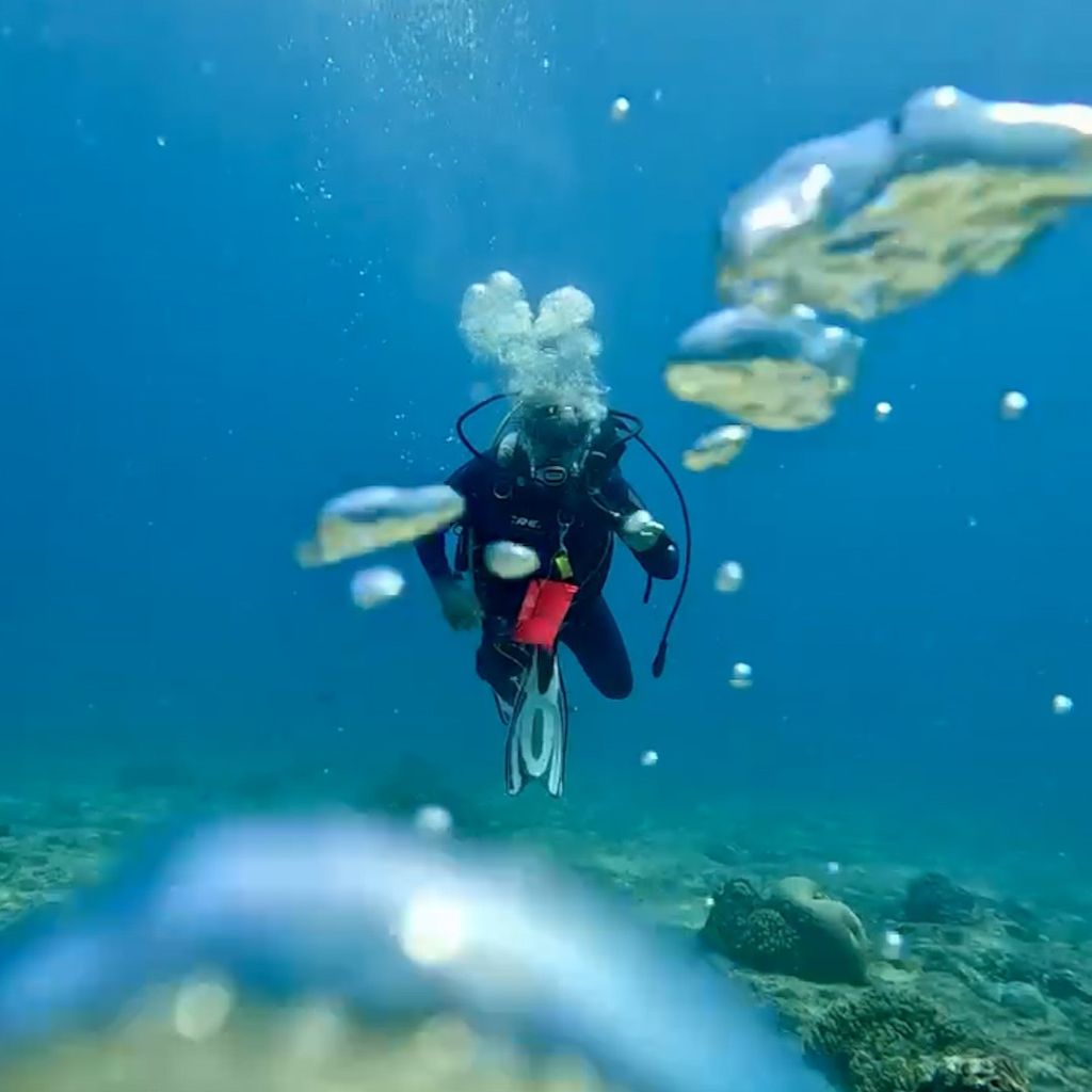 Wir treffen auf die Dugong während eines Tauchgangs, den wir unweit der Ilet Amedee unternehmen. Jenny und Lukas von der Lucky Jonny sind unsere Diveguides. Die Strömung der nahen Brandung am Außenriff ist zum Teil sehr stark und wirft uns hin und her.