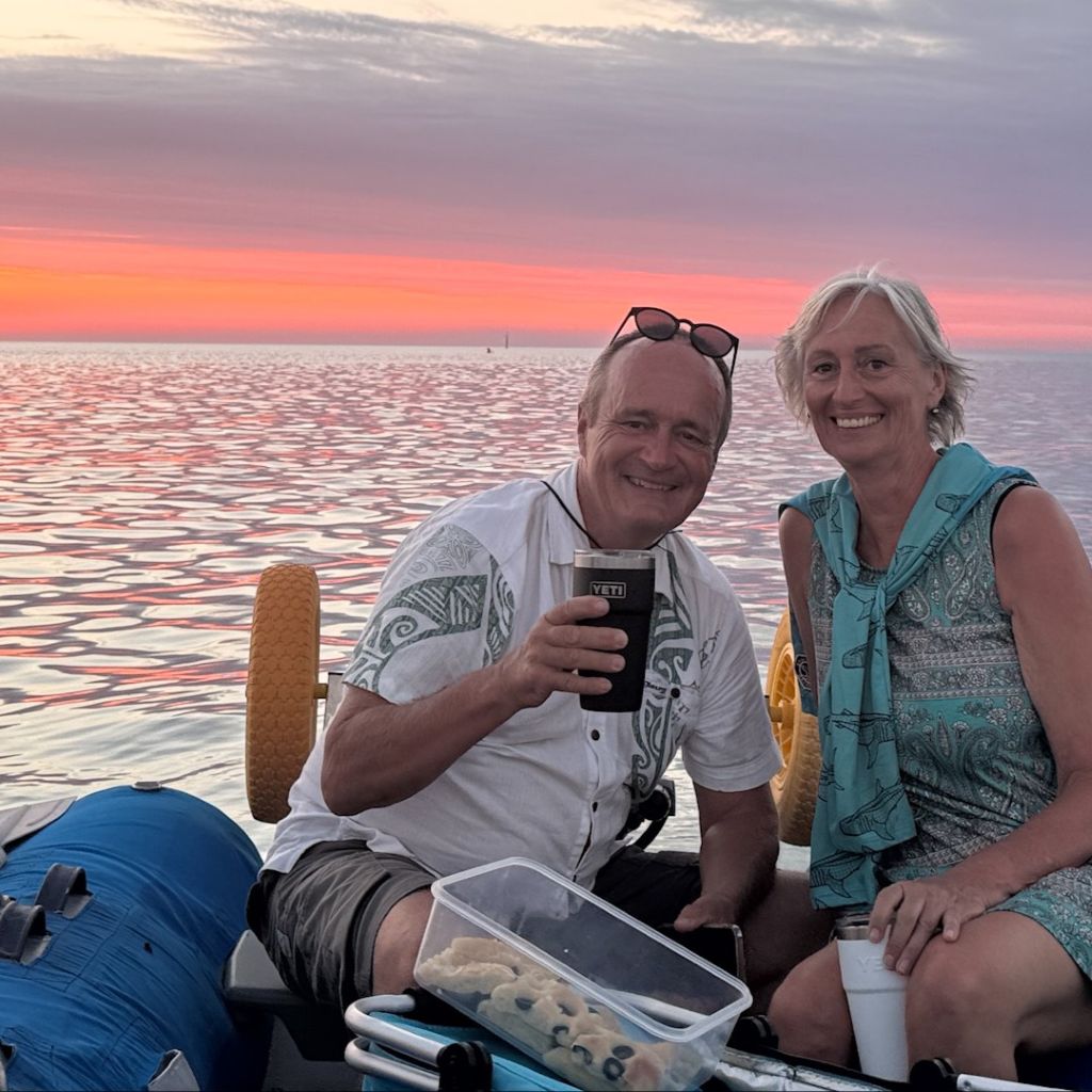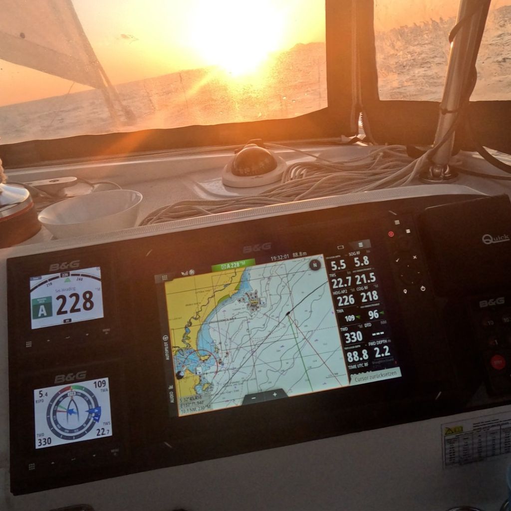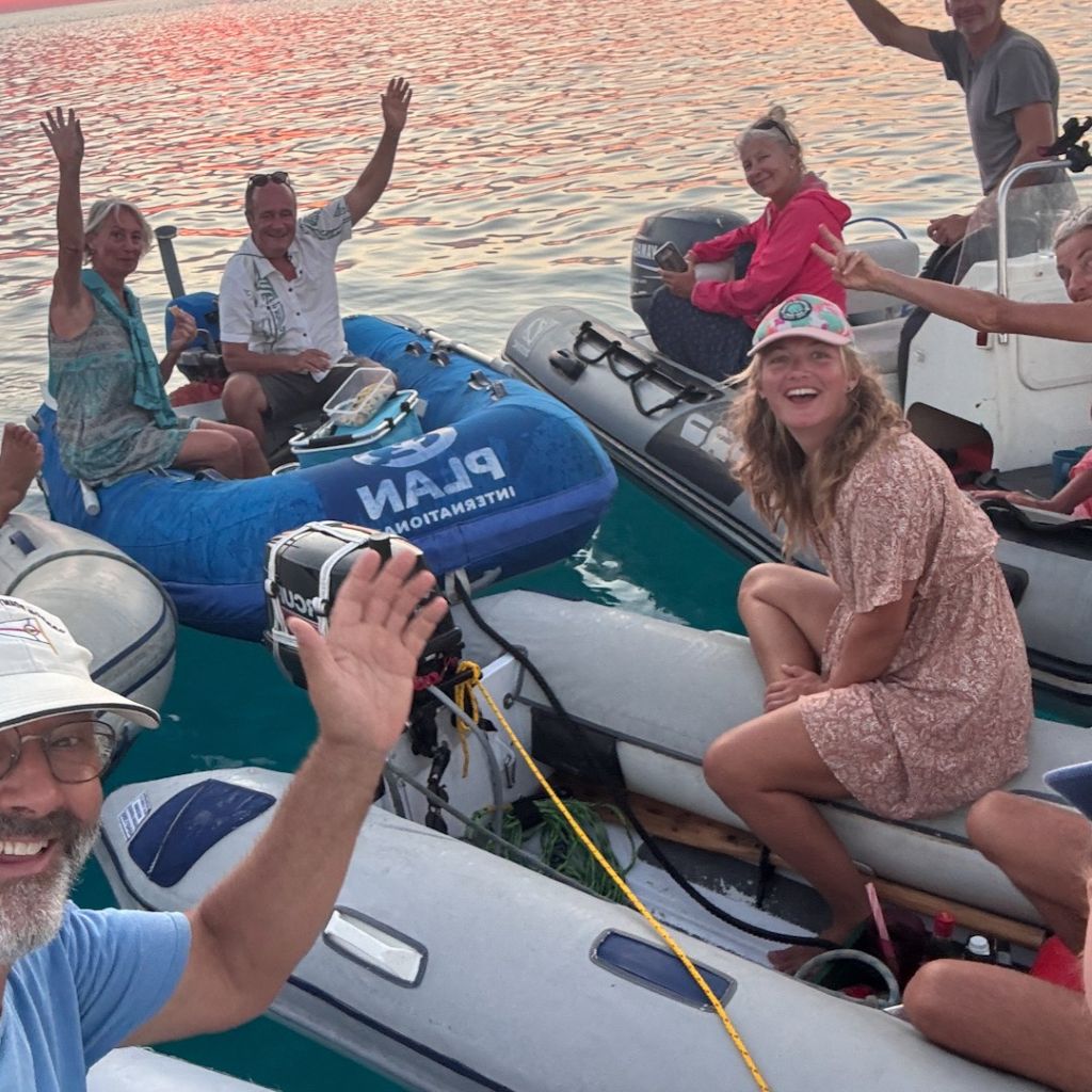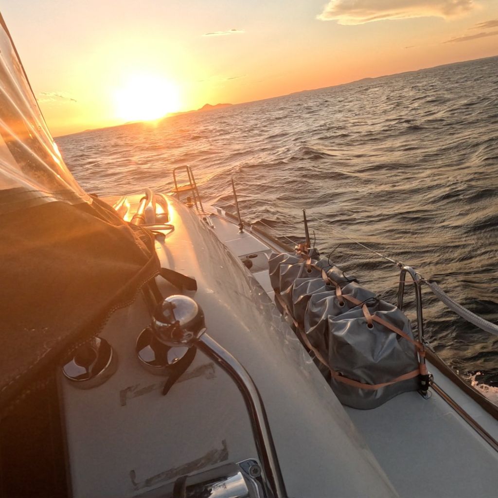 Am Abend treffen wir uns in einer Floating Dingy Party. Der erste Dingy wirft einen Anker und alle anderen machen sich am ersten Dingy fest. Während mitgebrachte Getränke und Knabbereien geteilt und konsumiert werden, versinkt die Sonne – wie so oft auf dieser Reise – spektakulär im Meer. Es ist unglaublich gesellig und das Dingygefüge entflechtet sich erst, als es pechschwarze Nacht ist. Jeder kehrt auf sein Schiff zurück – sie sind ja nicht weit.