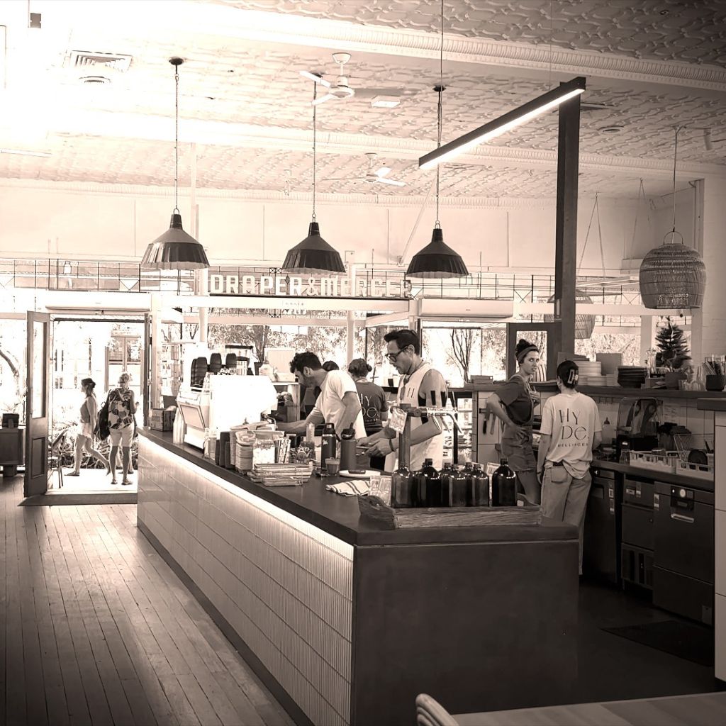 On the way back, we stop in Bellingen and visit the local bakery. Bellingen is a small town on the Bellinger River in New South Wales and has a number of listed buildings from the late colonial period. The sidewalks of Waterfall Way run through historic arcades. Detailed signs adorn the ceilings.