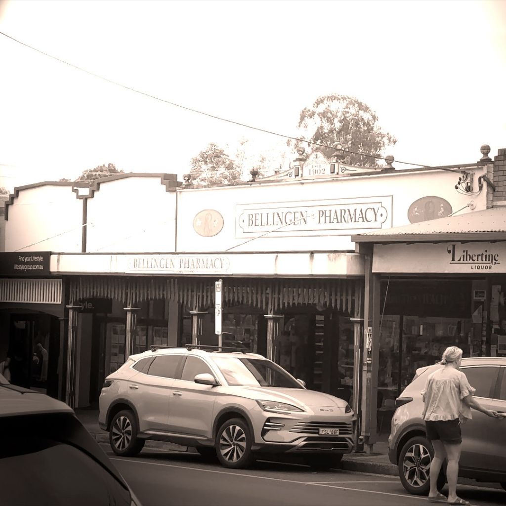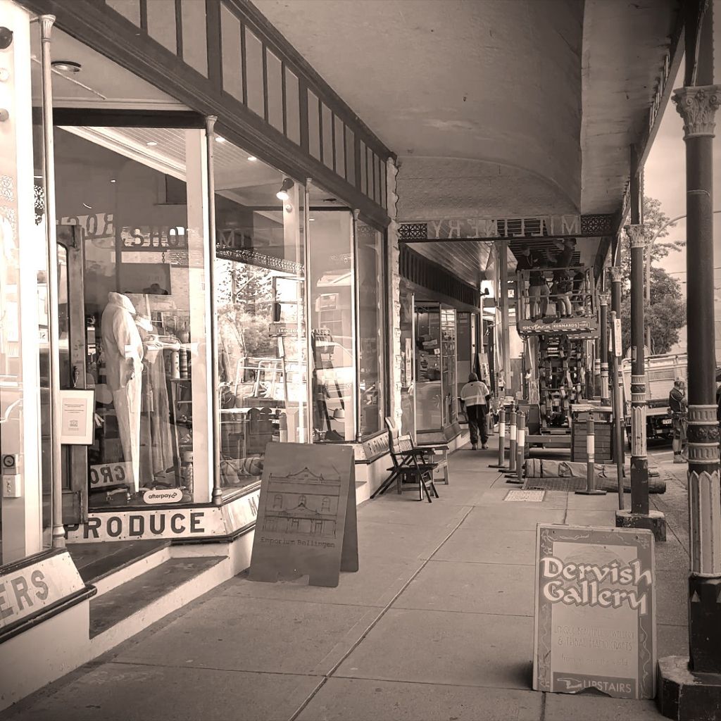 Auf dem Rückweg machen wir halt in Bellingen und kehren in der örtlichen Konditorei ein. Bellingen ist eine Kleinstadt am Bellinger River in New South Wales und weist eine Vielzahl denkmalgeschützter Gebäude der späten Kolonialzeit auf. Die Bürgersteige des Waterfall Way verlaufen in historischen Arkaden. Detailgetreue Schilder zieren die Decken.