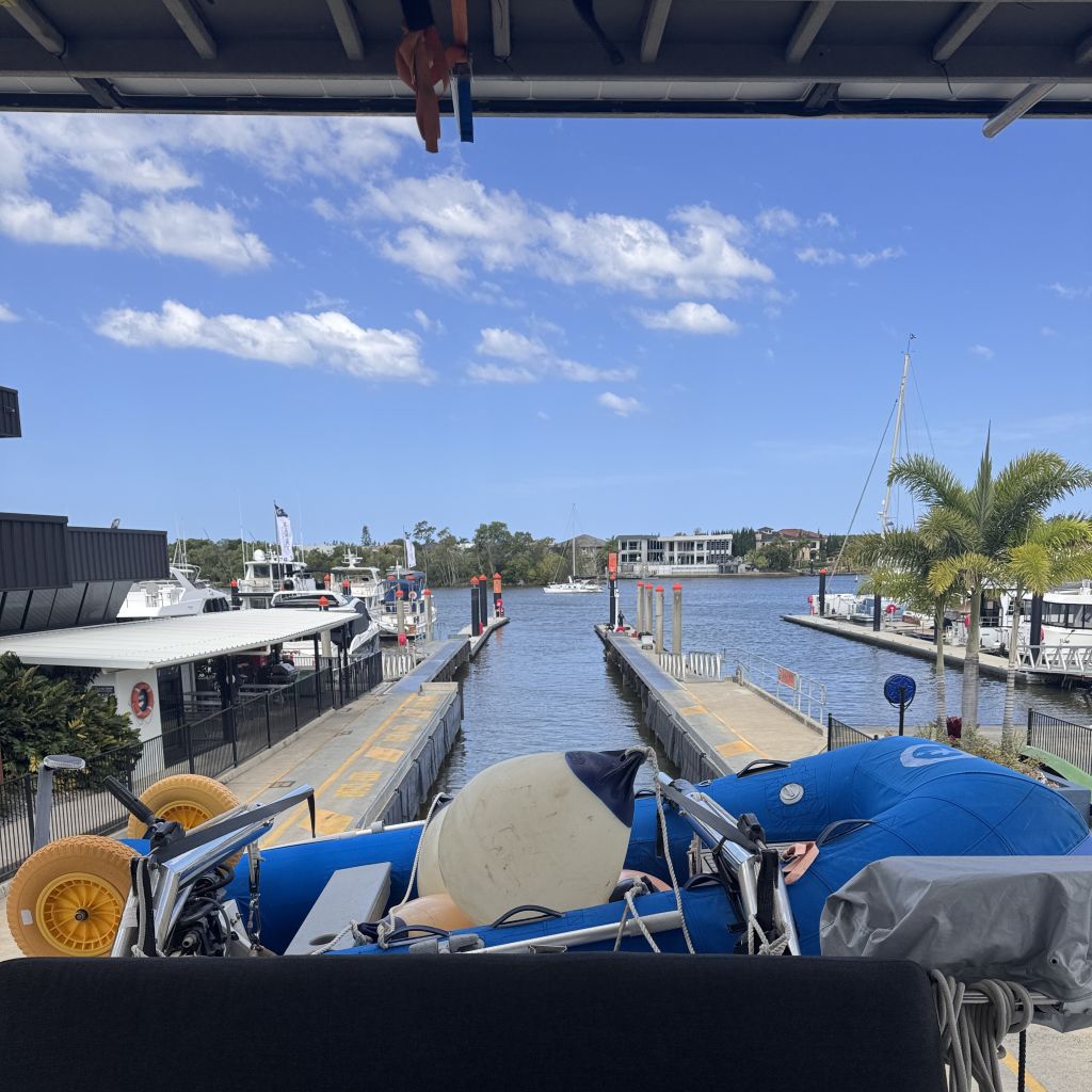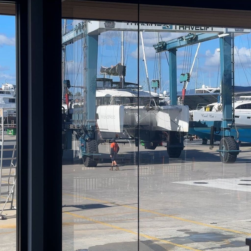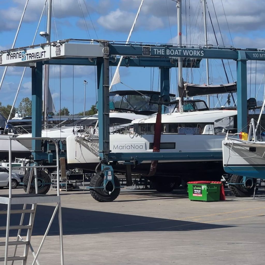 There is still a lot of work to be done for the sale. The boat yard “The Boats Works” was recommended to us. It is located in Coomera, Gold Coast in the hinterland and can only be reached via a river. It is a huge, highly professional site with various cranes to lift yachts from small monohulls to superyachts out of the water and carry out all kinds of work.