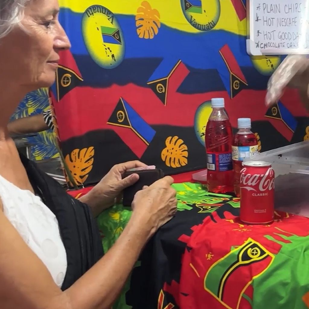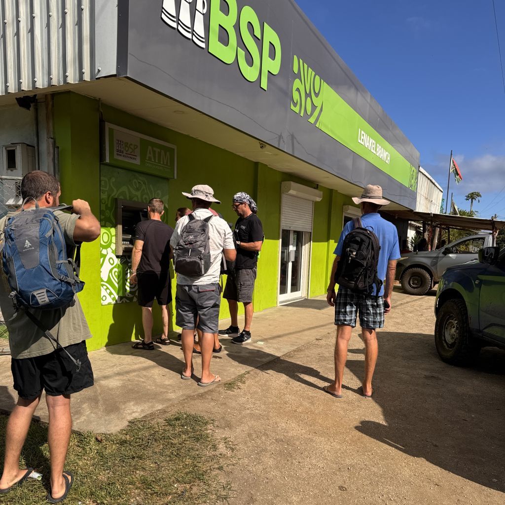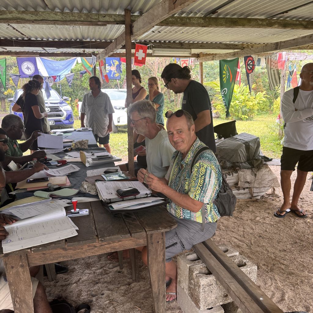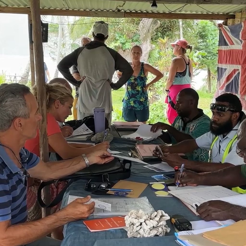 Per Funk werden wir zum Einklarieren gerufen. Der Einklarierungsprozess findet unter einem Fahnengeschmückten Dach mit einem traumhaften Blick auf die Anchorage statt. Ich sage den Mitarbeitern von Customs, Immigration und Biosecurity, dass dies das schönste Büro ist, dass ich je gesehen habe. Sie sind bereits am Vortag aus Lenakel dem Hauptort der Insel Tanna angereist, um die vielen Yachten abzuarbeiten. Brigitta hat wie immer den Einklarierungsprozess online perfekt vorbereitet, sodass wir schon nach wenigen Minuten alle Unterlagen vollständig in Händen halten. Wir können mit Vanu, australischen oder amerikanischen Dollar bezahlen. Die Umrechnungskurse sind sehr phantasievoll. Die absolute Unversehrtheit der Banknoten ist da schon wichtiger, da die Banken Geldscheine mit den kleinsten Macken nicht akzeptieren.