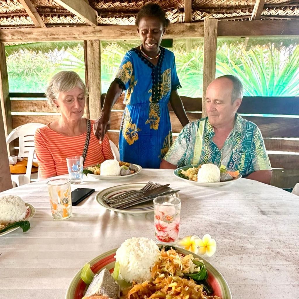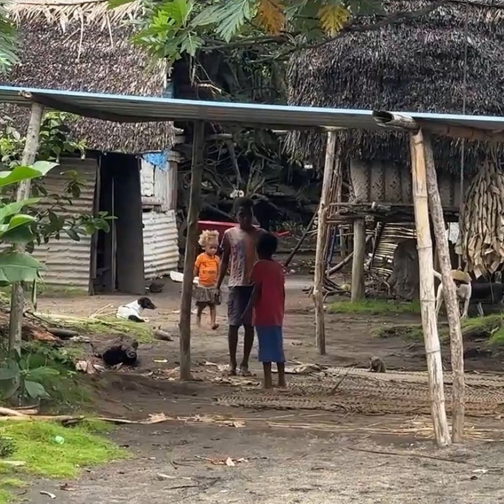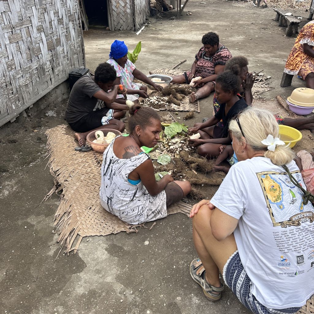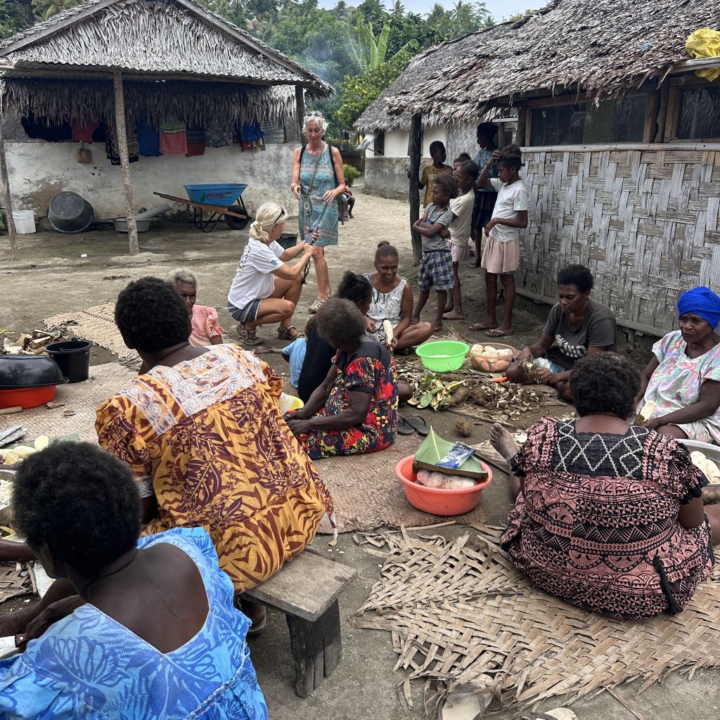 Im Anschluss an das Clear In machen wir einen ersten Rundgang durch das nahegelegene Dorf. Um einen kreisrunden Anger sind die Häuser für 1.000 Einwohner angelegt. Eingebettet in eine üppige Natur finden wir in dem ausgesprochen gepflegten Dorf Häuser, die aus den Materialien der umgebenden Regenwälder errichtet sind. Die Gemeinschaft der Familien steht im Mittelpunkt des Lebens: Gemeinsam werden die natürlichen Ressourcen geteilt. Älteste und lokale Führungspersonen spielen eine wichtige Rolle, vermitteln Weisheit und koordinieren Gemeinschaftsprojekte. Auf dem Anger findet zwecks Streitschlichtung gerade eine hitzige Debatte um das Kava-trinken von Frauen statt.