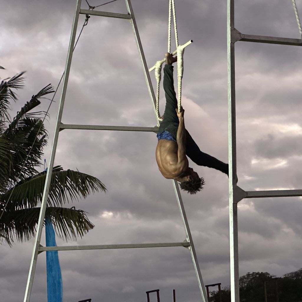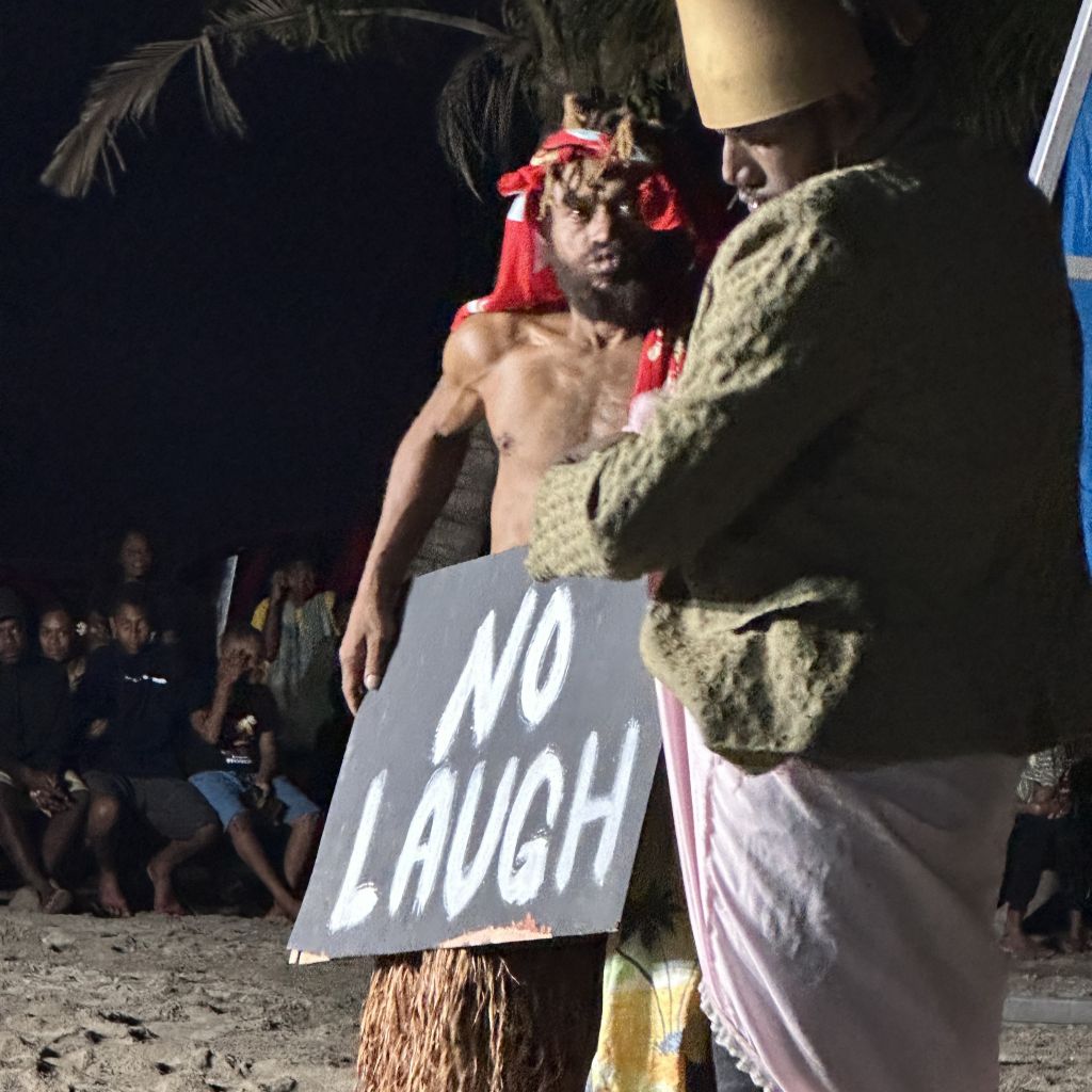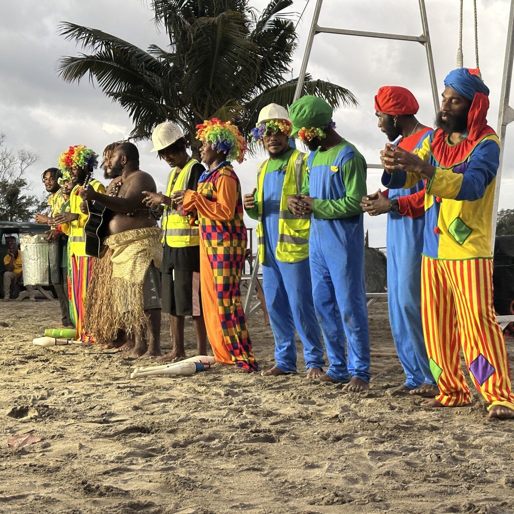 Den Mele Beach Club erreichen wir mit einem Sammeltaxi, das wir einfach an der Straße anhalten. Sammeltaxis werden auch Bus genannt, denn echte Busse gibt es nicht in Vanuatu. Hier im Mali Beach Club gibt es Freitags eine Fackelshow und Sonntags – wie heute – eine Artistik- und Lasershow. Insbesondere die Kinder haben ihren Spaß, wenn es knallt und kracht und laute Musik erschallt. Vor Sonnenuntergang werden verschiedene Waffen wie Zwillen, Pfeil und Bogen sowie die Muskete thematisiert. Kannibalismus ist Teil der eigenen Geschichte. Ein Artist zeigt spektakuläre Figuren im Trapez.