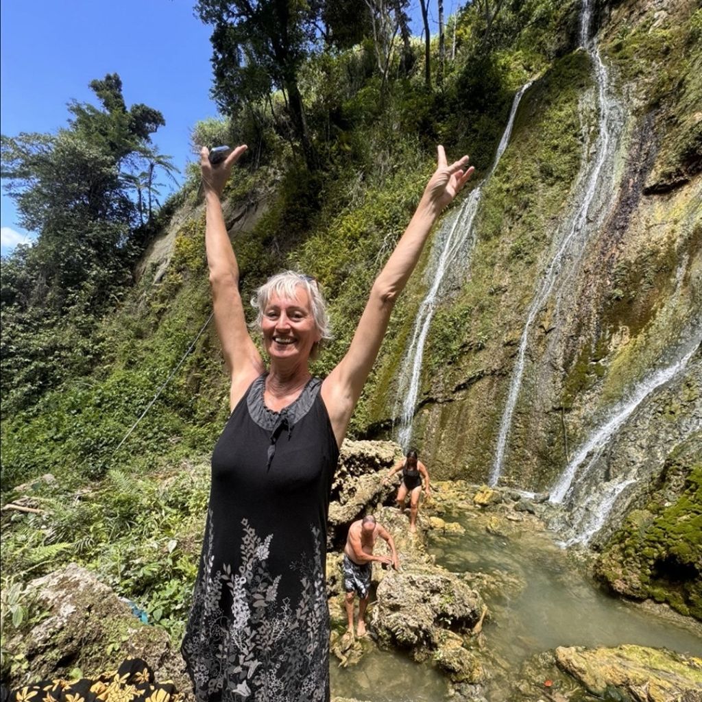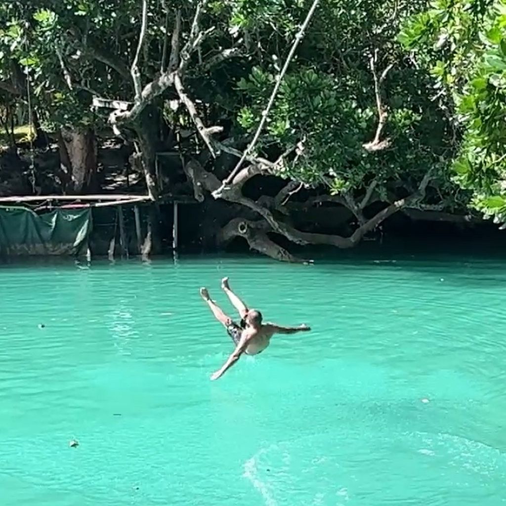 Der klare, türkisfarbene See „Blue Lagoon“ liegt in einer felsigen, grünen Umgebung und gilt als eines der bekanntesten Fotomotive der Insel Efate. Ein ruhiger, flacher Badesee mit feinem Sand am Ufer. Idealer Ort zum Schwimmen und Schnorcheln, der größte Spaß ist das Einschwingen an einem Seil. Bei zunehmender Leibesfülle aber abnehmender Muskelkraft muss ich erkennen, dass es lange her ist, dass dies bei mir sportlich ausgesehen hat.