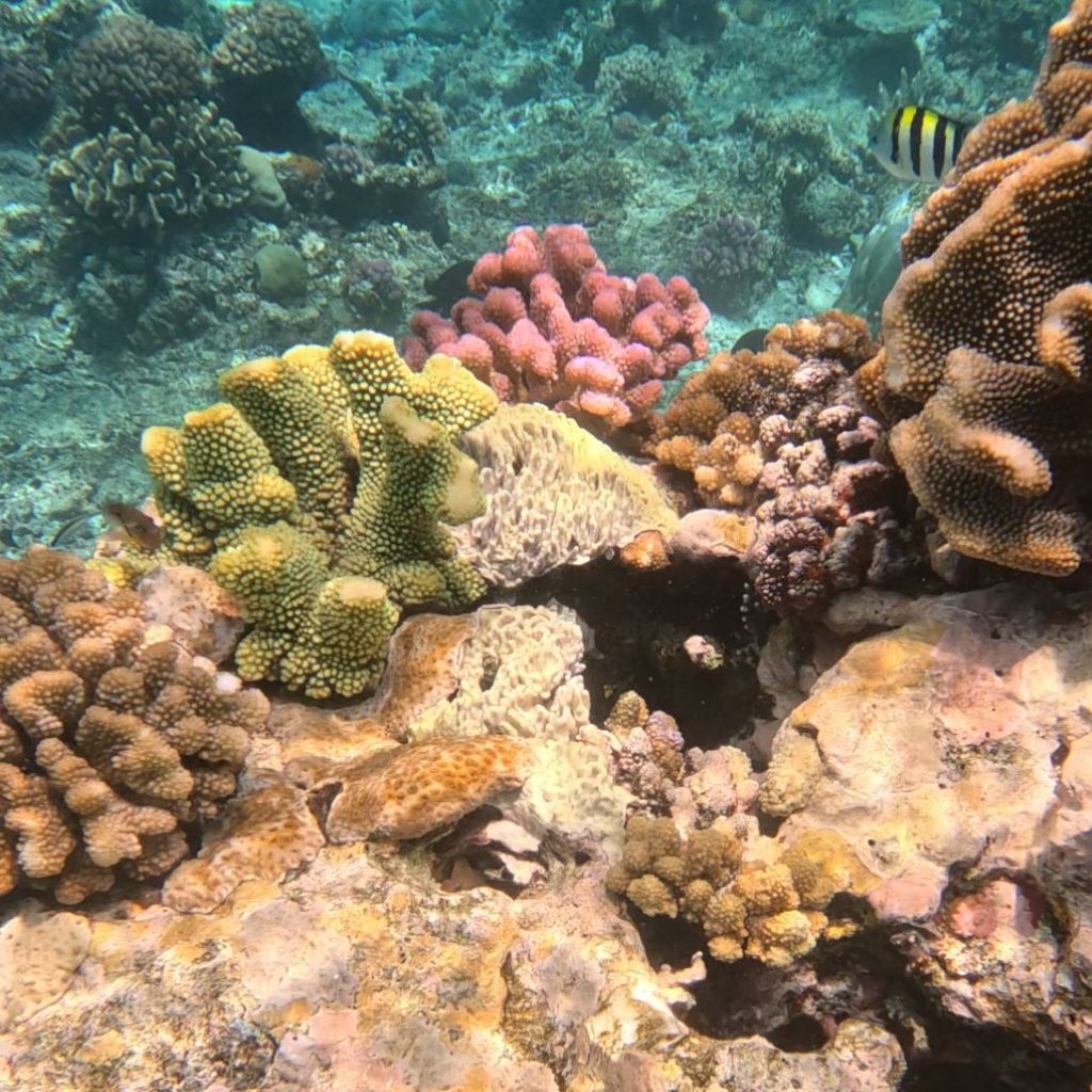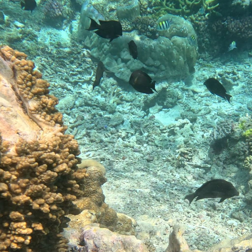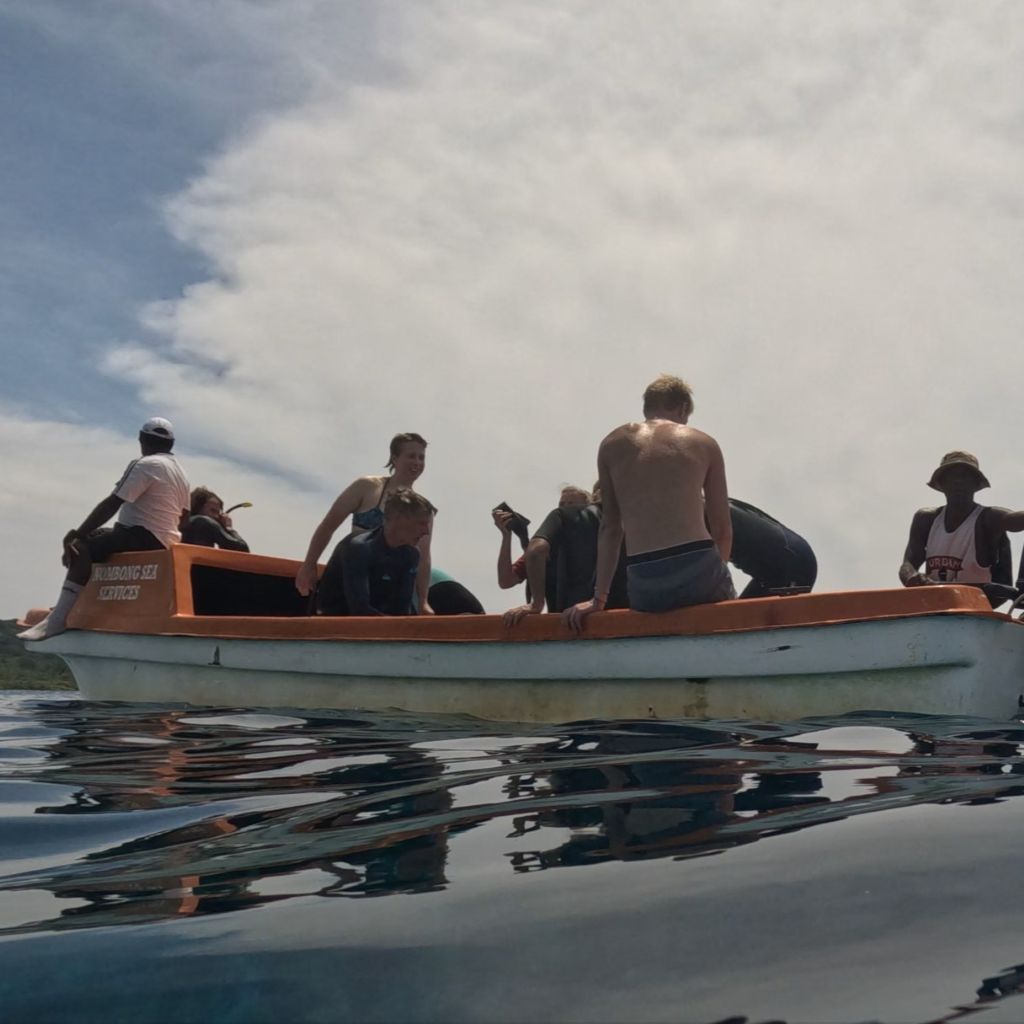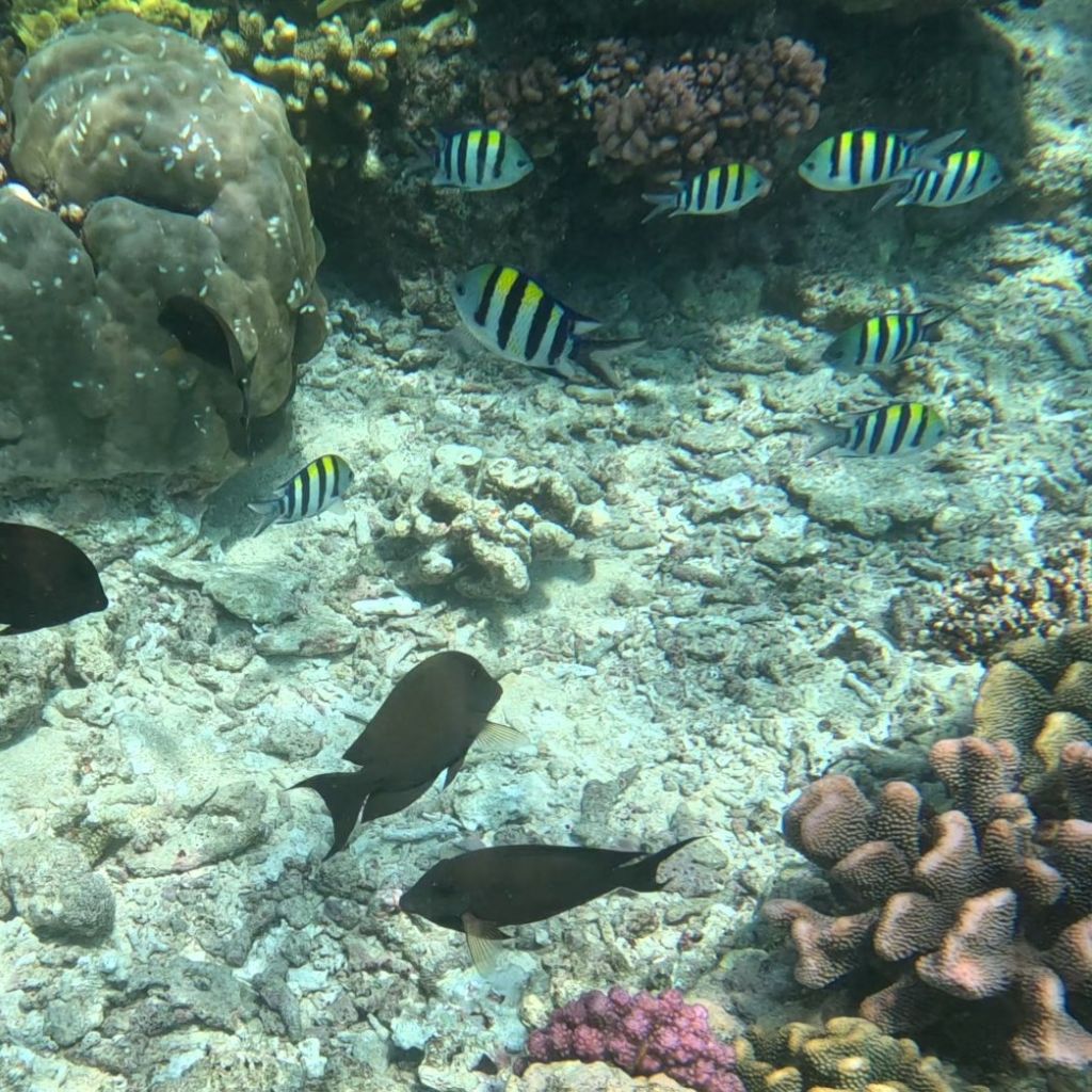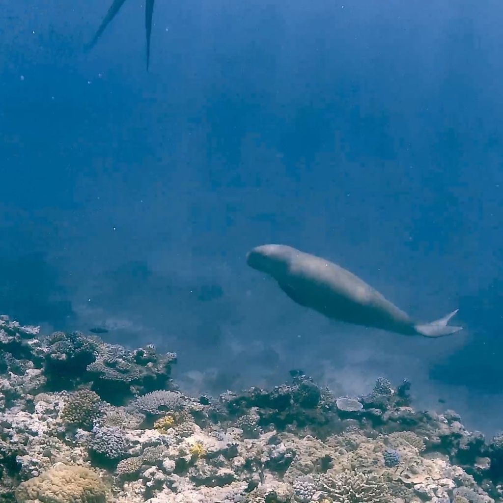 Das Boot, das uns zu den Dugongs abholt, ist gut gefüllt. An der ersten Stelle sind die Dugongs heute nicht anzutreffen, sodass wir weit hinausfahren müssen. Auch hier ist die Population nur klein. Dafür treffen wir auf eine bunte Korallenwelt mit noch bunteren Fischen.